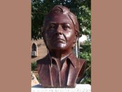 Este busto de tamaño natural, vaciado en bronce y patinado con un tono café rojizo, es obra del excelente retratista maestro Octavio González Gutiérrez, quien, por
