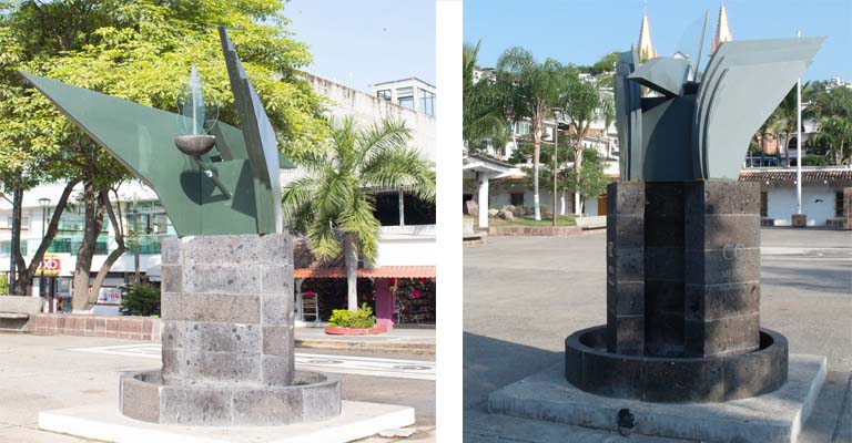 La escultura está instalada en un plinto alto de concreto, revestido con placas de la cantera oscura característica de Guadalajara, cargada de tezontle y otros fragmentos de piedras volcánicas. La planta del plinto tiene forma de una “C” angulada, cuyos extremos se cierran al frente, y se encuentra sobre una fuente circular, la que, a su vez, se asienta sobre una plataforma cuadrada. El fondo de la fuente está recubierto de mosaico.