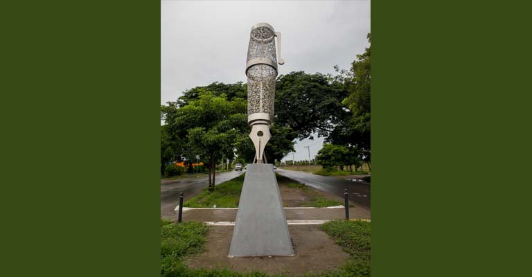 “Pluma Mágica (Magic Pen)” es una escultura de acero inoxidable, de cuatro metros de altura y uno de diámetro, instalada muy apropiadamente en 2018 en la banqueta poniente del entronque de la carretera Puerto Vallarta-Ixtapa y el acceso al Centro Universitario de la Costa, sobre una base de concreto en forma de pirámide truncada de cuatro caras, pintada de blanco. Representa una pluma fuente, que, con las paredes del depósito de tinta y de la tapadera recubiertas de filigrana, se yergue, parada sobre su punta e inclinada de norte a sur, lista para escribir. La tapadera está puesta sobre el depósito. La escultura tiene su propia iluminación eléctrica, consistente en una lámpara alimentada por una batería solar.