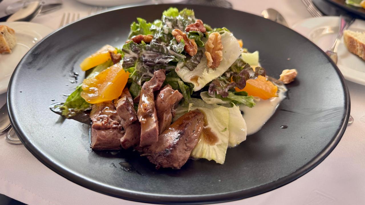 La primera sorpresa que Bernhard tenía preparada fue un Potenza Arancione, el cual es un vino naranja del norte de Italia. Este tipo de prensado está de moda en Europa; son llamados vinos naturales del Colli Piacentini ó Colinas de Piacenza de la zona de Emilia-Romagna. Y sí, habrá que aceptarlo, causó sorpresa entre los asistentes ya que al momento de servirlo presentaba un color ocre y un aspecto turbio no muy común en los vinos que se acostumbran a servir en las comidas de la Chaîne. Al maridar este diferente vino con una deliciosa ensalada de lechugas suaves, chutney de melón y corazón de ternera a la parrilla bañados de un aderezo de queso azul, el sabor del vino cambió y logró armonizar bien con la ensalada y la aprobación de los cofrades.