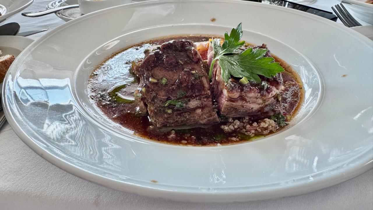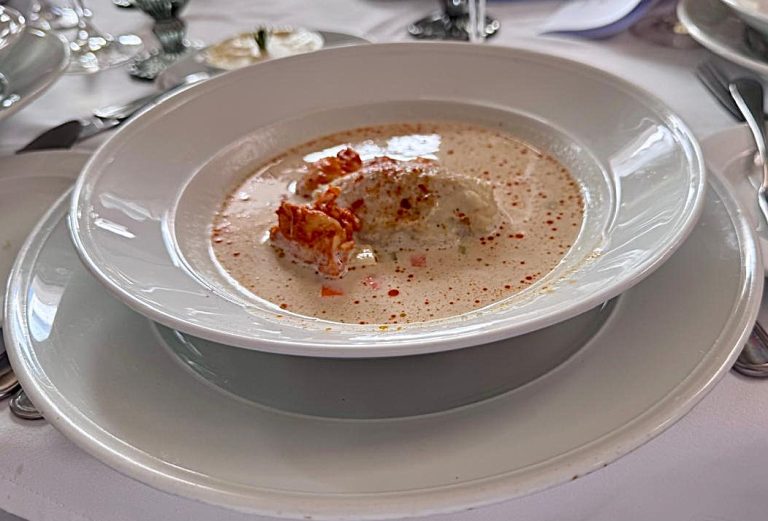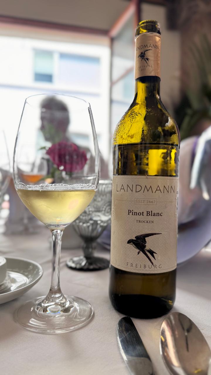 Quenelles de pescado blanco y callo de almeja en salsa de vino blanco y mantequilla acompañados de trozos de langosta suavemente adobados fue bien aceptado por los comensales quienes degustaron un pinot blanc orgánico 2023 Trocken de la bodega de Weingut Landmann en Freiburg, Baden Alemania. Por cierto, un viñedo muy famoso y turístico, constantemente con una alta demanda de quienes quieren hospedarse en el hotel dentro de las áreas de esta bodega.