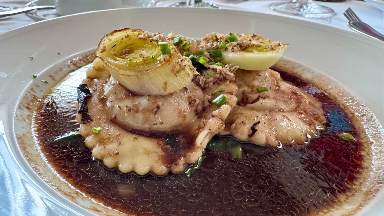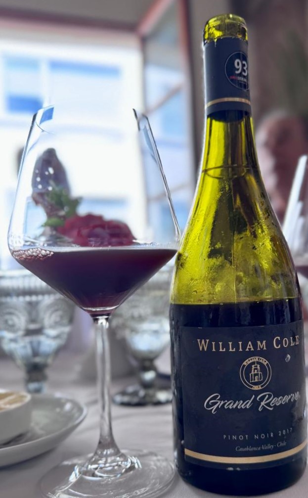 De los viñedos de Baden, nos transportamos hasta el Valle de Casablanca al sur de Santiago de Chile, antes de la ciudad costera de Valparaíso, para degustar otro Pinot, pero esta vez un Noir Gran Reserva 2019 de la casa William Cole el cual acompañó un ravioli de molleja de ternera y foie gras en su jus trufado. Este platillo de sabor intenso combinó extraordinariamente con el suave pinot noir chileno.