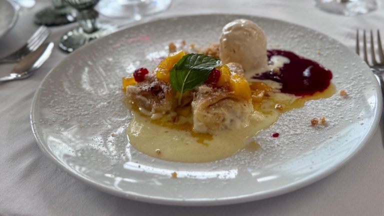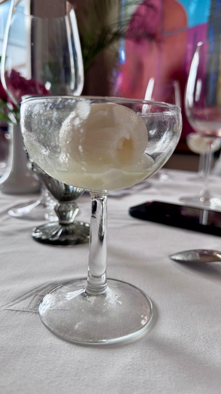 El acierto en la secuencia de sabores llegó con un sorbete de raicilla que el chef dispuso para limpiar el paladar justo antes de las crepas rellenas de mango, coronadas con un helado de chispas de chocolate que aportó el contraste perfecto entre lo cremoso y lo crujiente. El postre no solo superó ampliamente las expectativas de los asistentes, sino que encontró en un vino de cosecha tardía una alegre comparsa que elevó aún más el conjunto. Se trata de un delicado vino austriaco del pueblo de Jois, en la región de Burgenland, elaborado mayoritariamente con uva Welschriesling, cuya cosecha tardía le otorga un dulzor suave y delicado que armonizó a la perfección con las crepas, cerrando con broche de oro una experiencia gastronómica memorable.